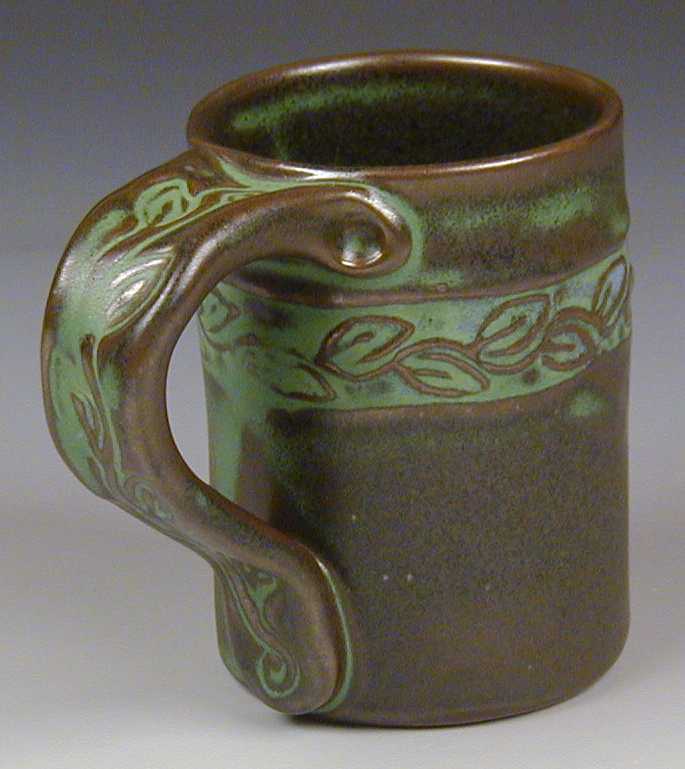 My friend and partner Stephanie made the wheel stamp for this mug. I made a single leaf stamp and hand carve the vines and spirals for the handle.